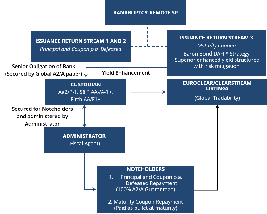 Baron Bond Global Bank DAFI™ Strategy could be structured to maintain a fixed [1.00]%(1) per annum, Annual Coupon in a ring-fenced A2/A global bank paper collateralization with 100% of the face value of the principal paid at maturity, secured at the Moody’s Aa2/P-1, S&P AA-/A-1+, Fitch AA/F1+ Custodian.