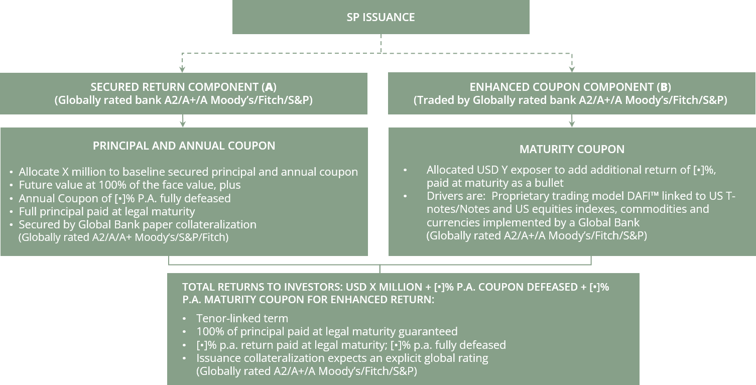 The Issuer will apply the net proceeds of the issuance of the Notes to (i) purchase an obligation issued by a Global Bank rated Moody’s A2, S&P A, and Fitch A+ (the “Global Bank Note”) which funds the full (100%) return of capital and the fixed [1.00] per cent per annum coupon paid out annually under the Notes (the “Annual Coupon”); and (ii) obtain exposure to a yield enhancement fixed coupon security equal [currently targeted in the 5.99 to 6.99 range] per cent per annum, paid out as a bullet payment on the Maturity Date (the “Maturity Coupon”)